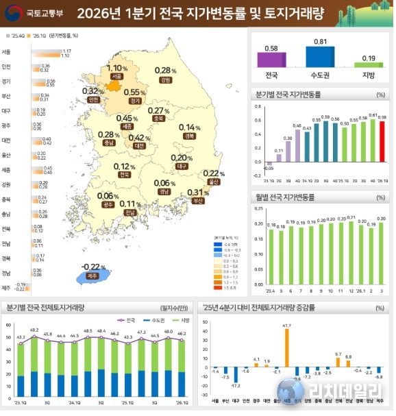 리치데일리 김상현 기자 | 국토교통부와 한국부동산원(원장 이헌욱)은 '26년 1분기 지가변동률 및 토지거래량을 발표했다.