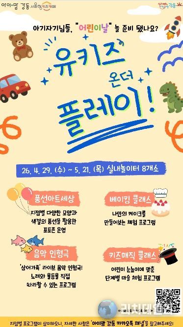 한편, 5월 5일 어린이날에는 강동구청 열린뜰과 강동어린이회관 일대에서 ‘2026 강동어린이대축제’가 열린다. ‘컬루와 친구들’ 축하공연을 시작으로 다양한 체험 프로그램과 공연, 참여형 놀이가 펼쳐진다. 특히, ‘장난감 순환마켓’에서는 강동구 장난감도서관에서 대여하던 상태 양호한 장난감 200여 점을 저렴하게 판매해 자원순환을 실천하고 가정의 경제적 부담을 덜어줄 것으로 기대된다.