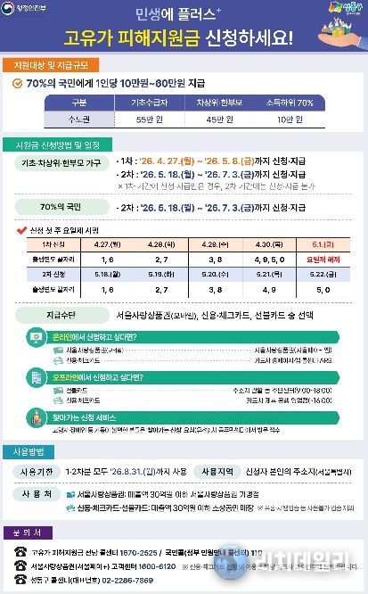 이번 ’고유가 피해지원금‘은 1차와 2차로 나뉘어 순차적으로 지급된다. 먼저 1차 지급은 기초생활수급자와 차상위계층, 한부모가족을 대상으로 4월 27일부터 5월 8일까지 진행되며, 기초생활수급자에게는 1인당 55만 원, 차상위계층 및 한부모가족은 1인당 45만 원이 지급된다.