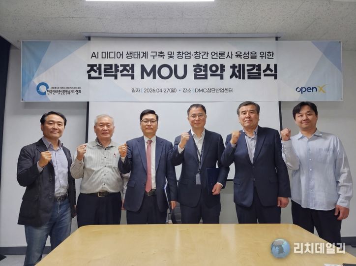 리치데일리 김상현 기자 | 한국인터넷신문방송기자협회(회장 전병길, 이하 협회)와 오픈엑스(대표 김미진)는 지난 2026년 4월 27일 서울 상암동 DMC첨단산업센터에서 업무협약(MOU)을 체결하고, 제휴 언론사 육성과 건강한 미디어 생태계 강화를 위해 적극 협력하기로 뜻을 모았다.