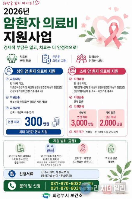 리치데일리 김상현 기자 | 의정부시 보건소는 암환자의 경제적 부담을 완화하고 안정적인 치료 환경을 조성하기 위해 소아‧성인 암환자 의료비 지원사업을 추진하고 있다.
