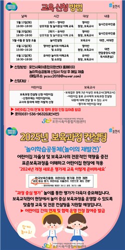 이에 따라 포천시육아종합지원센터 놀이학습공동체 교육은 영아반 보육교사, 유아반보육교사로 나눠 집중적으로 세밀하게 교육을 높였으며, 5월 13일 영아반 교육의 시작으로 유아반 교육은 5월 20일 진행될 예정이다. 교육이 끝나면 전문 컨설턴트에 의한 컨설팅이 진행되며, 진행 후 6월 12일 소모임 지원을 통해 구체적 놀이 지원 사례 공유 등 보육교직원 간 소통의 장을 마련할 예정이다.