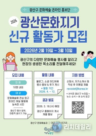 리치데일리 김상현 기자 | 광주 광산구가 광산구 문화예술 온라인 홍보단 ‘2026년 광산문화지기’ 참여자를 3월 10일까지 모집한다.