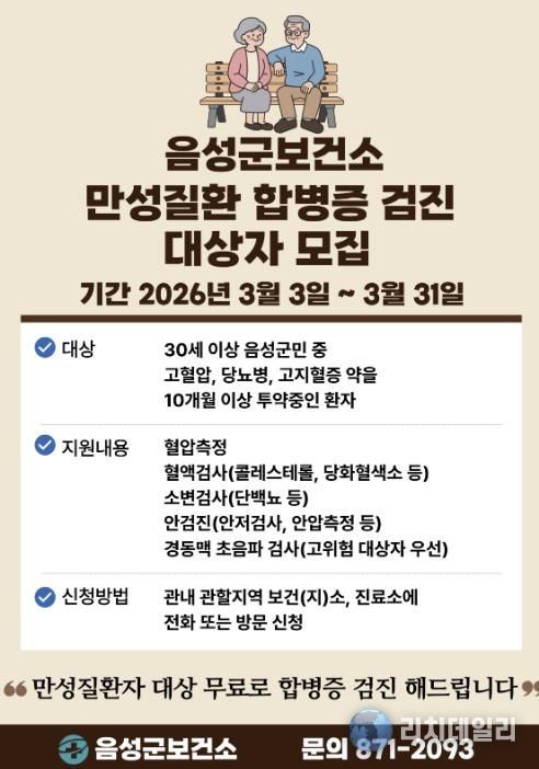 리치데일리 김상현 기자 | 음성군보건소는 만성질환자의 합병증을 조기에 발견하고 중증 심뇌혈관질환을 예방하기 위해 3월 3일부터 31일까지 ‘2026년 만성질환 합병증 검진 사업’ 대상자를 모집한다.