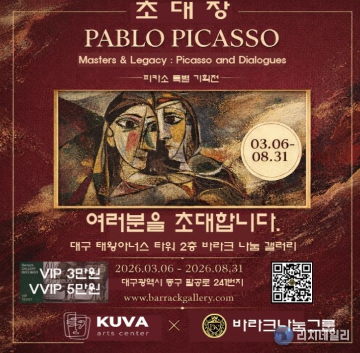 리치데일리 김상현 기자 | 한 도시의 전시장이 한 시대의 미술사를 온전히 담아내는 일은 결코 가벼운 과제가 아니다. 2026년 3월 6일부터 8월 31일까지 대구 동구 봉무동 바라크나눔갤러리에서 열리는 피카소 인 대구 피카소와 전설의 거장들 특별전은 이러한 학술적 무게를 정면으로 다루며 지역 문화계에 새로운 이정표를 제시한다. 이번 전시는 단순히 세계적 명화를 나열하여 선보이는 단발성 행사를 넘어 20세기 미술이 형성해온 사유의 구조를 하나의 정교한 큐레이토리얼 맥락 안에서 재구성하려는 기획이다.