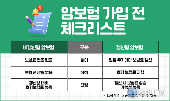 보험료 부담을 줄이려다 보면 저렴한 암보험을 찾게 마련인데 이때 암보험이 갱신형인지 비갱신형인지도 확인할 필요가 있다. 갱신형 암보험은 처음 납입하는 보험료가 저렴하게 느껴지지만 갱신을 할수록 보험료가 계속 높아질 수 있다. 반면 비갱신형은 초기 보험료는 갱신형보다 비싸게 느껴질 수 있지만 앞으로 오르지 않는다는 장점이 있으므로 갱신형 보험보다는 유지 면에서 유리하다. 개인의 소득과 생활패턴, 연령이 다르므로 암보험 갱신형과 비갱신형 중 선택을 하기 전 이러한 차이를 잘 알아두고 본인에게 가장 적합한 것을 고르는 것이 좋다.