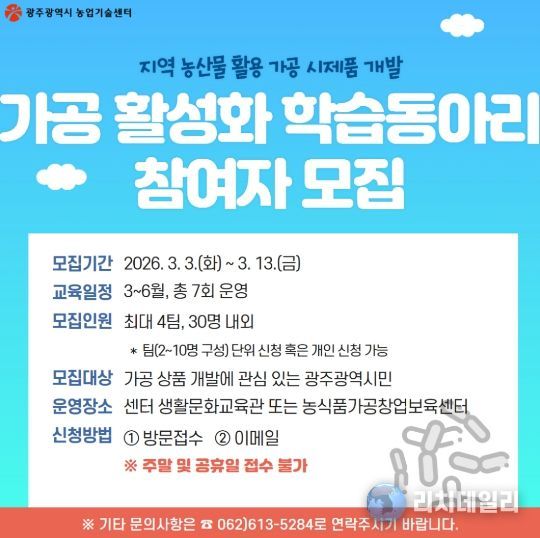리치데일리 김상현 기자 | 광주광역시 농업기술센터는 지역 농산물을 활용한 참신한 가공 시제품 개발을 지원하기 위해 ‘가공 활성화 학습 동아리’ 참여자 최대 4팀, 30명 내외를오는 13일까지 모집한다.