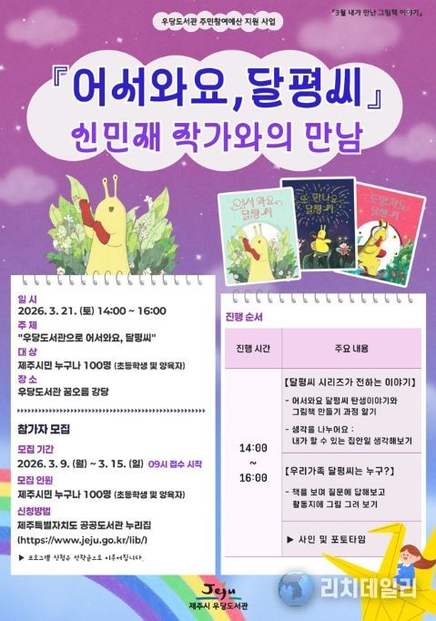 리치데일리 김상현 기자 | 제주시 우당도서관은 성장기 어린이들의 건강한 독서습관 형성과 창의력 향상을 위해 ‘어서와요, 달평씨’의 저자 신민재 그림책 작가와의 만남을 3월 21일 개최한다.