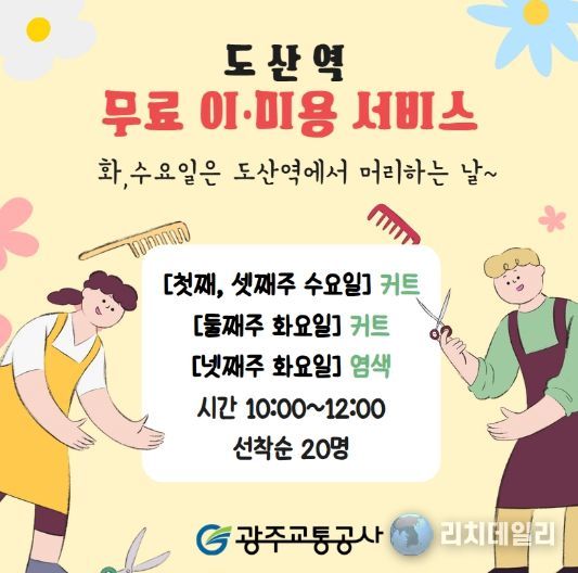리치데일리 김상현 기자 | 광주교통공사(사장 문석환)는 광산구자원봉사센터(이사장 박병기)와 함께 지역사회 상생과 나눔 실천을 위해 3월부터 11월까지 광산구 도산역에서 지역 주민을 대상으로 무료 이·미용 서비스를 운영한다.