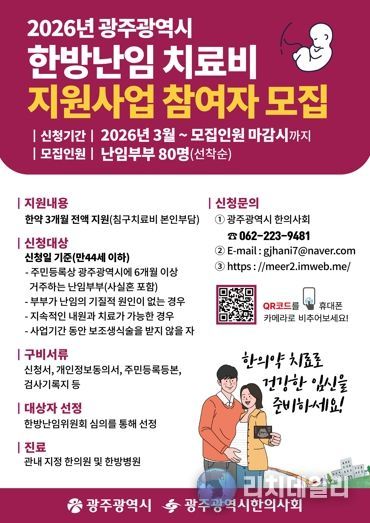 리치데일리 김상현 기자 | 광주광역시는 난임 부부의 임신·출산을 돕고 치료에 따른 경제적 부담을 덜어주는 ‘2026년 한방 난임치료비 지원사업’을 시행한다.