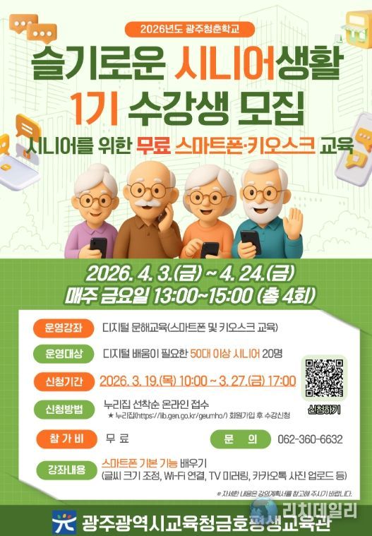 리치데일리 김상현 기자 | 광주시교육청금호평생교육관은 오는 4월 3일부터 7월 31일까지 50대 이상 시니어를 대상으로 디지털 역량 강화 프로그램인 ‘2026 슬기로운 시니어생활’을 운영한다.