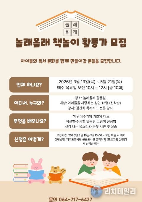 리치데일리 김상현 기자 | 제주도교육청 제주도서관은 19일부터 성인을 대상으로 전문적인 책놀이 활동가 양성을 위한 ‘놀래올래 책놀이 활동가 교육’ 프로그램을 운영한다.