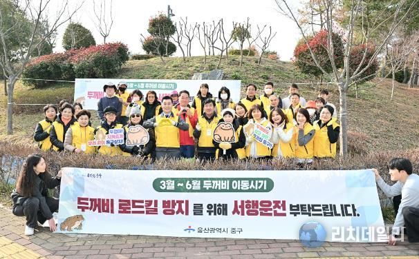 리치데일리 김상현 기자 | 울산 중구가 3월 10일 오후 1시 장현저류지 일대에서 민관합동 두꺼비 찻길 사고(로드킬) 방지 활동을 펼쳤다.