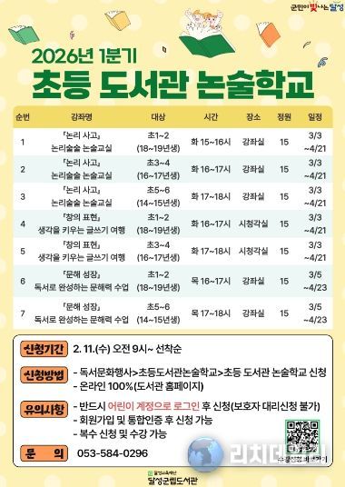 달성군립도서관은 이달부터 지역 주민을 위한 ‘2026년 1분기 평생학습 프로그램’과 초등학생의 문해력을 키워주는 ‘초등 도서관 논술학교’을 통해 총 14개 강좌를 운영 중이라고 밝혔다.