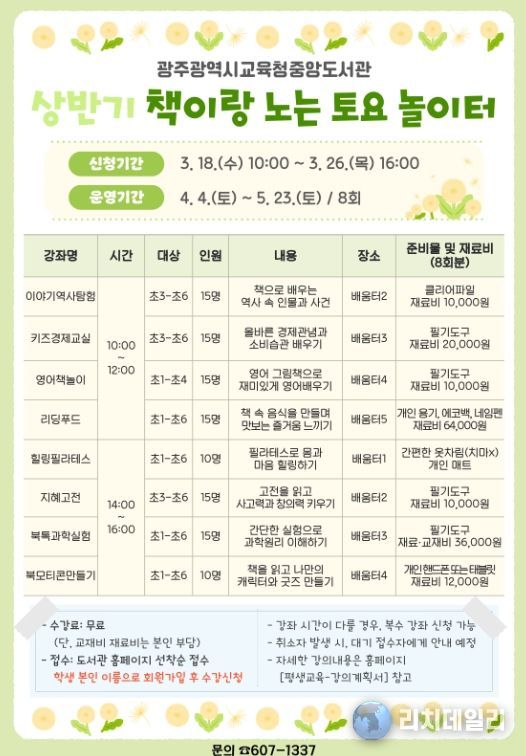 리치데일리 김상현 기자 | 광주광역시교육청중앙도서관은 오는 4월 4일부터 5월 23일까지 초등학생을 대상으로 ‘2026년도 상반기 책이랑 노는 토요 놀이터’ 프로그램을 운영한다.