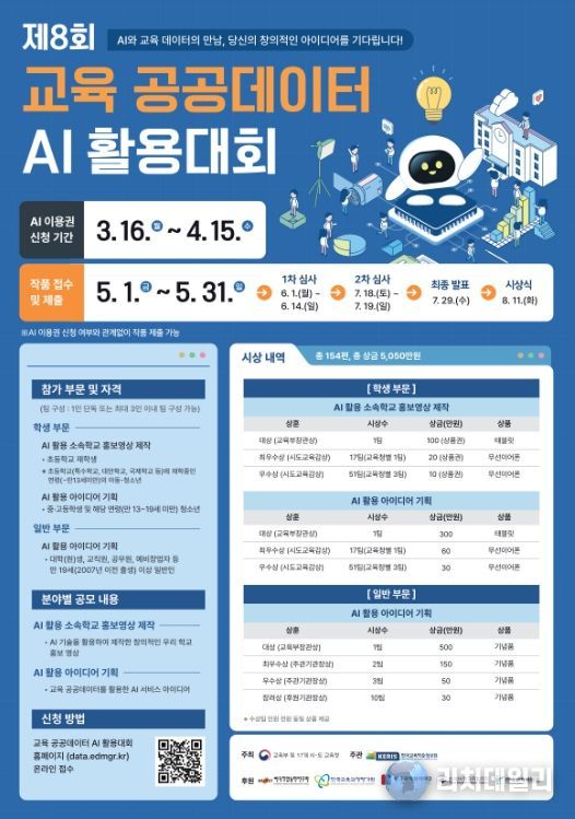 AI 이용권 신청은 오는 16일부터 다음달 15일까지, 작품 제출은 5월 1일부터 5월 31일까지 교육 공공데이터 분석활용대회 누리집(data.edmgr.kr)을 통해 하면 된다.