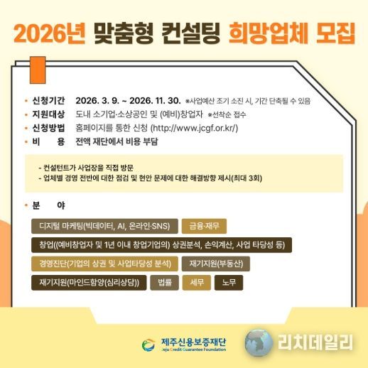 리치데일리 김상현 기자 | 제주신용보증재단은 급변하는 경영환경과 소비자 트렌드에 대응할 수 있는 기업가형 소상공인을 육성하기 위해 '2026년도 맞춤형 컨설팅 사업'에 참여할 희망 업체를 3월 9일부터 모집하고 있다고 밝혔다.