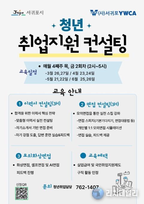 리치데일리 김상현 기자 | 서귀포시는 관내 청년들의 실질적인 취업 역량 강화를 위해 (사)서귀포YWCA와 공동으로 ‘청년 취업지원 컨설팅’ 교육생을 모집한다고 밝혔다.