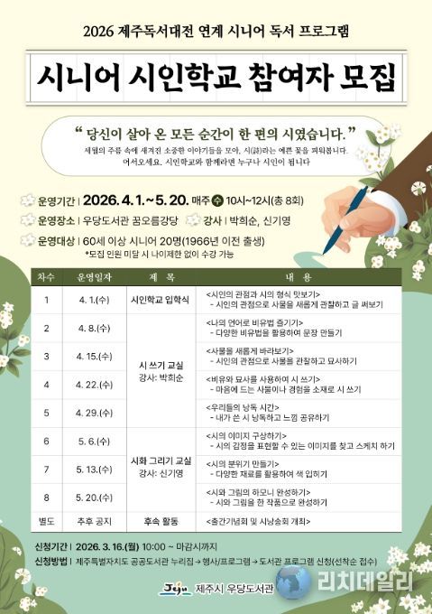 리치데일리 김상현 기자 | 제주시 우당도서관은 2026 제주독서대전과 연계해 시민의 삶과 경험을 문학적 가치로 재발견하는 특별 프로그램인 ‘시니어 시인학교’ 참여자를 모집한다.