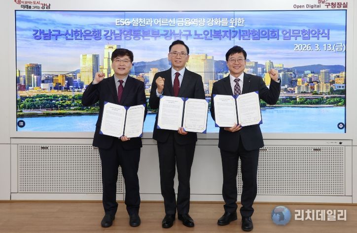 리치데일리 김상현 기자 | 꿈이 모이는 도시, 미래를 그리는 강남구가 13일 구청에서 ㈜신한은행 강남영동본부, 강남구 노인복지기관협의회와 3자 업무협약을 체결하고 어르신 금융역량 강화 교육을 추진한다. 이번 협약은 디지털 금융환경 변화에 따른 어르신들의 금융 소외를 예방하고, 보이스피싱 등 금융사고로부터 안전한 일상을 지원하기 위해 마련됐다.