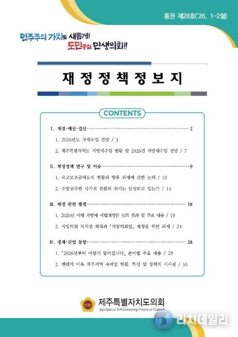 리치데일리 김상현 기자 | 제주특별자치도의회는 3월 13일, 지방재정의 전문성을 높이고 주요 정책 현안을 분석한 '재정정책정보지' 통권 제28호(2026년 1~2월)를 발간했다고 밝혔다.