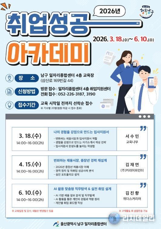 리치데일리 김상현 기자 | 남구 일자리종합센터는 변화하는 채용 환경에 대응하고 일반 구직자의 취업 경쟁력 강화를 위해 ‘2026 취업성공 아카데미’를 운영한다.