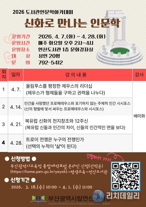 리치데일리 김상현 기자 | 부산시교육청 연산도서관은 4월 7일부터 28일까지 매주 화요일 오후 2시부터 도서관 문화강좌실에서 성인 20명을 대상으로 도서관 인문학 아카데미 ‘신화로 만나는 인문학’을 개최한다.