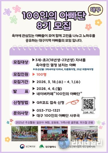 리치데일리 김상현 기자 | 대구광역시는 아빠들의 적극적인 육아 참여를 독려하고 함께 육아하는 사회 분위기를 확산하기 위해 3월 18일부터 ‘2026년 제8기 대구 100인의 아빠단’ 활동 단원을 모집한다.