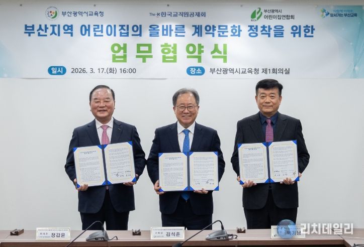 리치데일리 김상현 기자 | 부산광역시교육청은 17일 오후 교육청 회의실에서 한국교직원공제회, 부산광역시어린이집연합회와 함께 부산지역 어린이집의 올바른 계약문화 정착을 위한 업무협약을 체결했다.