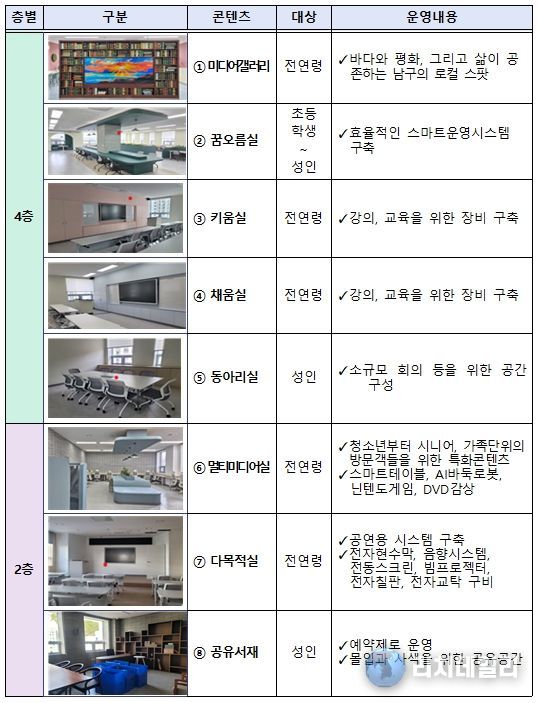 ▲2층 학습·커뮤니티 공간은 온 가족이 함께 즐길 수 있는 스마트테이블, 인공지능(AI) 바둑로봇, 닌텐도 게임공간을 갖추었으며 ▲4층 스마트 강의실은 전자칠판과 태블릿을 활용해 영어 및 코딩 교육 등 미래 인재 양성을 위한 맞춤형 프로그램을 제공하는 공간으로 조성했다.