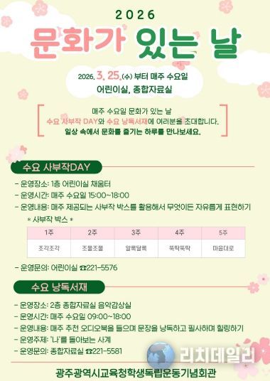학생독립운동기념회관 김용일 관장은 “시민과 어린이들이 일상을 작은 축제처럼 즐길 수 있는 열린 도서관을 만들겠다”며 “매주 수요일마다 열리는 ‘문화가 있는 날’ 프로그램에 많은 시민과 어린이들이 참여하길 바란다”고 말했다.