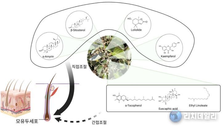 연구진은 보리밥나무 가지 추출물을 분석한 결과, 모유두세포의 증식과 활성화에 직접적인 효과를 보이는 4가지 핵심 천연성분을 확인했다. 해당 성분은 β-sitosterol(강화 140%, 증식 117%), α-amyrin(증식 148%), loliolide(강화 112%), kaempferol(강화 182%)로 세포 실험 결과, 인체 모유두세포를 직접적으로 자극하는 효과를 보였다.