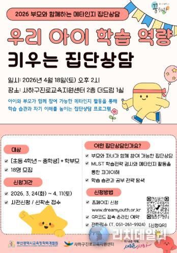 리치데일리 김상현 기자 | 사하구진로교육지원센터는 오는 4월 18일 토요일 오후 2시, MLST 학습전략 검사와 부모·자녀 간 학습 역지사지 역할극 활동을 통해 타인과 자기 이해에 도움을 주는 '메타인지 집단상담' 프로그램을 운영한다.