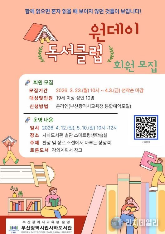 리치데일리 김상현 기자 | 부산광역시립사하도서관은 오는 4월 12일과 5월 10일 오전 10시부터 사하도서관 별관 스마트평생학습실에서 성인 10명을 대상으로 ‘원데이 독서클럽’을 운영한다.