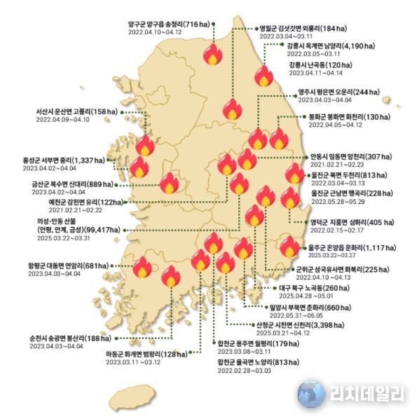 리치데일리 김상현 기자 | 산림청 국립산림과학원은 최근 5년간 발생한 대형산불의 발생 위치와 산림 유형 분포를 분석한 결과, 대형산불이 특정 지역이나 수종에 집중되지 않고 다양한 산림 유형에서 발생한 것으로 나타났다고 밝혔다.