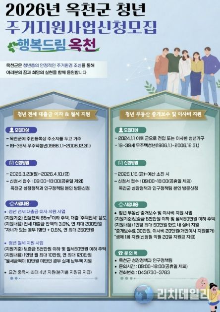 리치데일리 김상현 기자 | 옥천군은 청년 주거비 부담 완화와 안정적인 지역 정착 지원을 위해 ‘청년 전세 대출금 이자 지원’과 ‘청년 월세 지원’ 사업 대상자를 모집한다고 밝혔다.