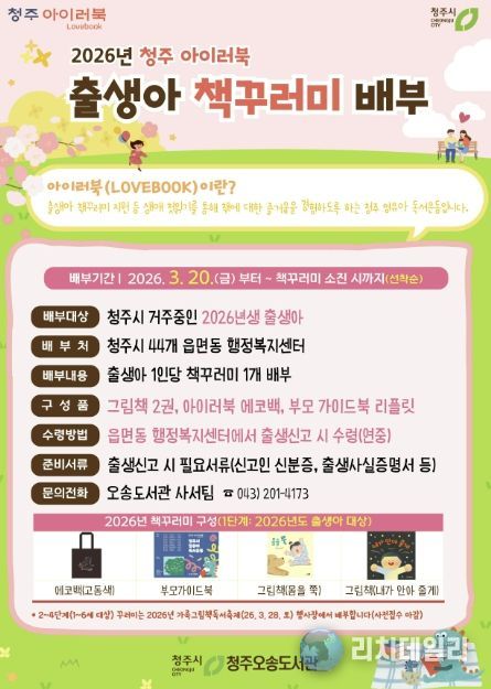 리치데일리 김상현 기자 | 청주오송도서관은 영유아 독서운동 ‘청주 아이러북(LoveBook)’의 일환으로 2026년 출생아를 위한 생애 첫 책꾸러미를 배부한다고 23일 밝혔다.