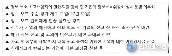 정보통신망법 개정안은 사이버 침해사고 예방부터 대응까지 전 범위를 강화하는 것을 골자로 한다. 기업의 정보 보호 역량을 높이고 관련 정보 보호 인증 체계를 강화하여 침해사고 발생을 더 효과적으로 예방할 수 있게 되며, 사고 발생이 의심되면 정부의 조사가 가능해져 사이버보안 침해사고에 더욱 빠르게 대응할 수 있게 된다. 무엇보다 침해사고로 인한 국민의 피해를 방지하기 위해서 기업의 사회적, 법적 책임을 강화하는 내용을 담고 있다.