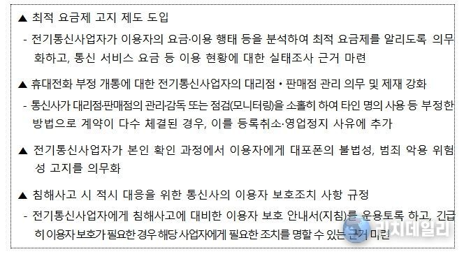이번 전기통신사업법 개정안은 ①통신사업자가 이용자의 데이터 사용 유형(패턴) 등을 분석하여 최적 요금제를 주기적으로 알림으로써 이용자가 합리적인 요금제 선택을 할 수 있도록 지원하고, ②사기전화(보이스 피싱) 등 범죄 예방을 위해 휴대전화 부정 개통과 관련된 통신사업자의 대리점·판매점 관리 의무 및 제재를 대폭 강화하며, ③침해사고 발생 시 통신사업자의 신속한 대응 체계 구축을 위한 이용자 보호 안내서(매뉴얼) 마련 및 과기정통부의 긴급 조치 명령 근거 마련 등의 내용을 포함한다.