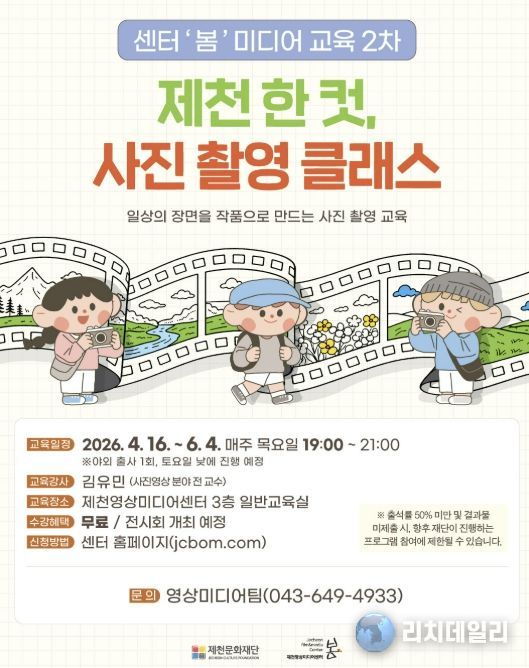 리치데일리 김상현 기자 | 제천문화재단이 오는 31일부터 사진 촬영 교육 ‘제천 한 컷, 사진 촬영 클래스’의 수강생을 모집한다.
