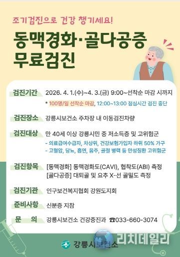 리치데일리 김상현 기자 | 강릉시보건소는 오는 4월 1일부터 3일까지 인구보건복지협회 강원도지회와 연계하여 동맥경화 및 골다공증 무료검진을 실시한다.