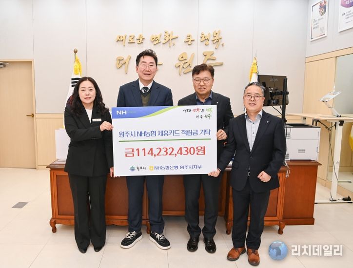 리치데일리 김상현 기자 | 원주시는 지난 24일 시청에서 원강수 시장, 김주석 NH농협 원주시지부장 등이 참석한 가운데 NH농협 제휴카드 적립금 전달식을 가졌다.