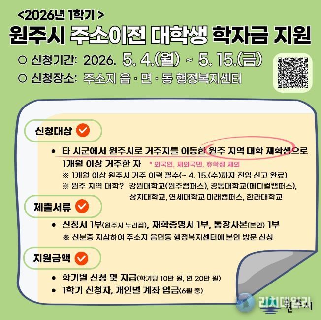 리치데일리 김상현 기자 | 원주시는 전입신고를 마치고 원주시민이 된 대학생에게 상·하반기 각 10만 원씩 연간 20만 원의 학자금을 지원한다.