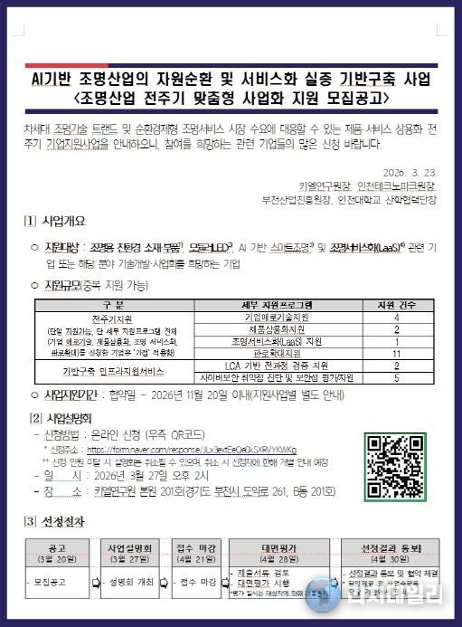 이번 사업은 인천광역시와 부천시 등 지자체를 비롯해 주관기관인 키엘연구원, 부천산업진흥원, 인천대학교가 함께하며, 친환경·디지털 전환 흐름에 맞춰 조명산업의 자원순환 구조를 구축하고 서비스 기반 산업으로의 전환을 돕기 위해 마련됐다.