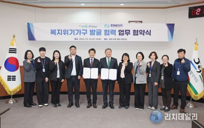 리치데일리 김상현 기자 | 제주시는 3월 25일 시청 본관 회의실에서 한전MCS 제주지사(지사장 황성태)와 ‘복지위기가구 발굴 협력’ 업무 협약을 체결했다.