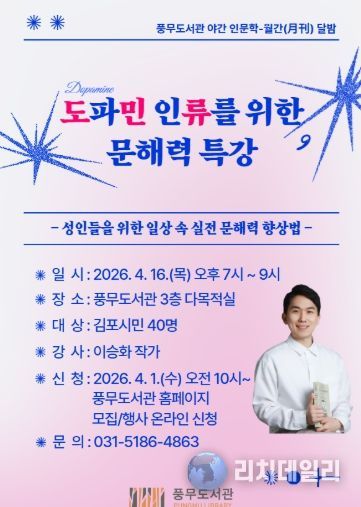 리치데일리 김상현 기자 | 김포시 풍무도서관은 도서관주간을 맞아 오는 4월 16일 오후 7시부터 야간 인문학 프로그램으로 ‘도파민 인류를 위한 문해력 특강’을 운영한다.