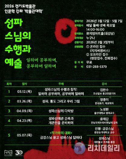 또한, 경기도박물관은 본 전시와 연계해 ‘성파스님의 수행과 예술-일하며 공부하며, 공부하며 일하며’를 주제로 인문학강좌(5회)를 마련했다. 3월 26일에는 ‘성파, 통도 그리고 우리 그림’이라는 주제로 정종미 한국화가가 미술재료를 탐구하는 강의를 진행한다. 자세한 내용은 경기도박물관 누리집(musenet.ggcf.kr) 참고.