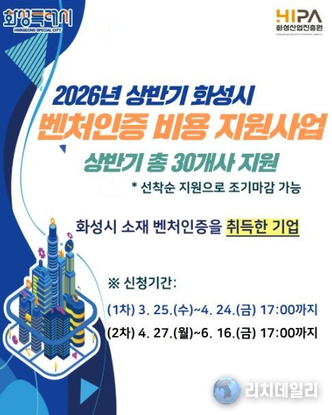 리치데일리 김상현 기자 | 화성산업진흥원(원장 전병선)은 관내 벤처기업 경쟁력 강화를 위해 ‘2026년 상반기 화성시 벤처인증 비용 지원사업’ 참여기업을 오는 4월 24일까지 모집한다고 밝혔다.