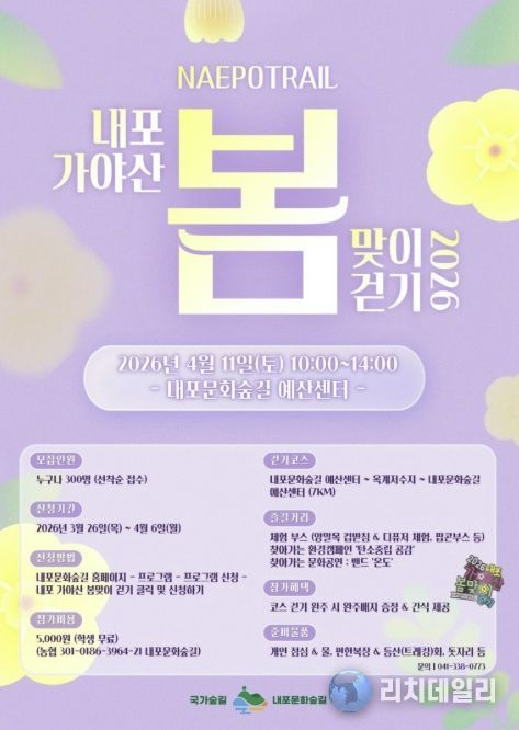 참가 신청은 3월 26일부터 4월 6일까지 내포문화숲길 누리집을 통해 가능하며, 선착순 300명을 모집하고 참가비는 성인 5000원, 학생은 무료로 참여할 수 있다.