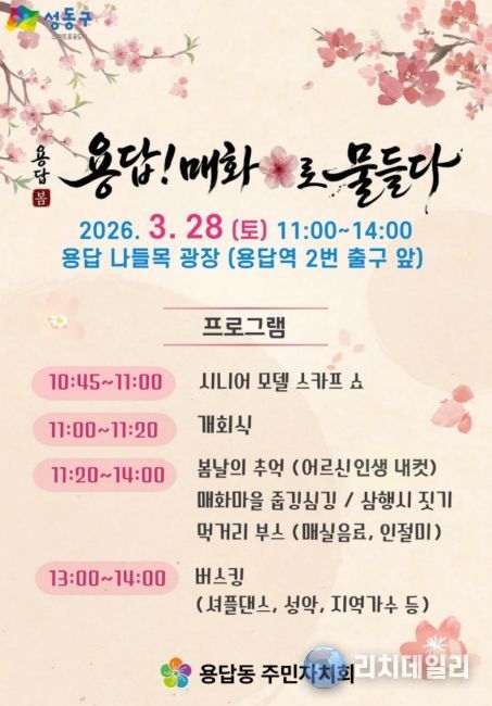리치데일리 김상현 기자 | 서울 성동구 용답동은 오는 3월 28일 11시부터 용답 나들목 광장(용답역 2번 출구 앞)에서 ‘용답! 매화로 물들다’행사를 개최한다고 밝혔다.